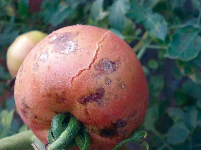 2.施肥不当造成裂果。作物在果实生长期需要大量的钾肥,与此同时氮肥的需求量降低,而此时如果大量施用氮肥而忽略钾肥用量的话,会造成果实钾素缺乏还会影响作物对钙、硼元素的吸收。例如:西红柿脐部裂果的其中一个主要原因就是矿质元素钙的缺乏。因此在果实生长期为防止矿质元素供应失调,应该适当控制氮肥的施用量,适当增施钾肥以满足果实生长发育所需肥料养分。